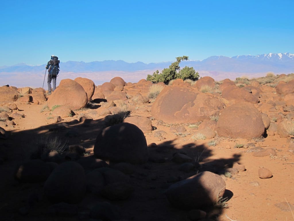 Der letzte Anstieg führt über ein urtümliches Hochplateau mit knorrigen Bäumen. Am Horizont das schneebedeckte M’Goun-Massiv. Dann der lange Abstieg ins Dades-Tal: Stunden bergab, schmerzende Knie, müde Füße.