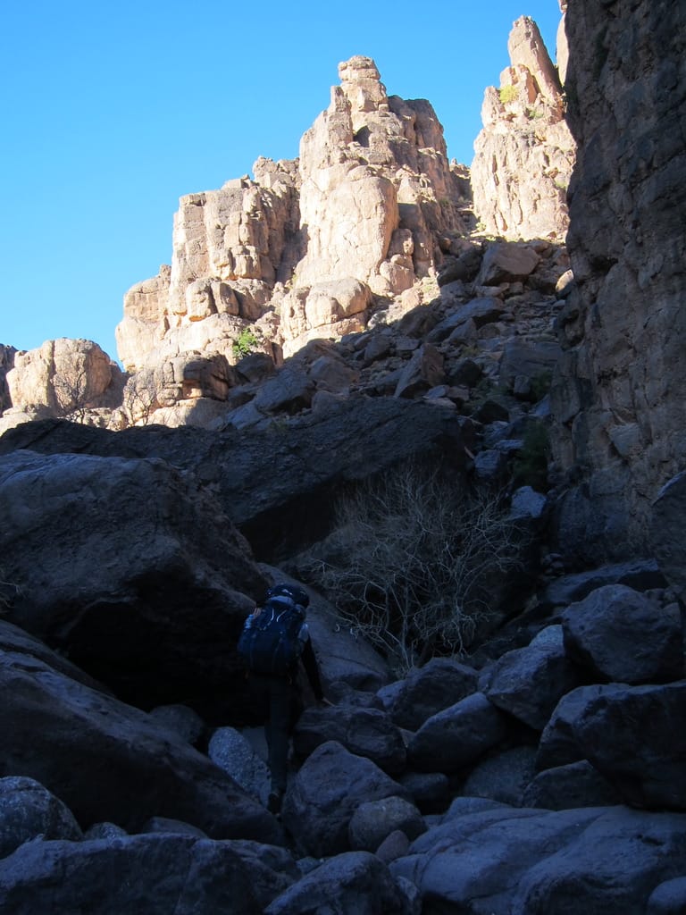 Das Tal endet in Blockgelände: Klettern, Steigen, Balancieren. Schließlich öffnet sich die Landschaft, eine Piste führt oberhalb des Tals Richtung Boilouz. Den beschriebenen Abzweig finden wir nicht. In der Dämmerung bauen wir das Zelt auf.