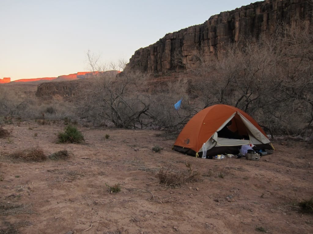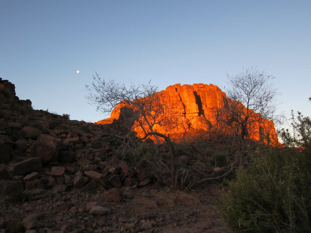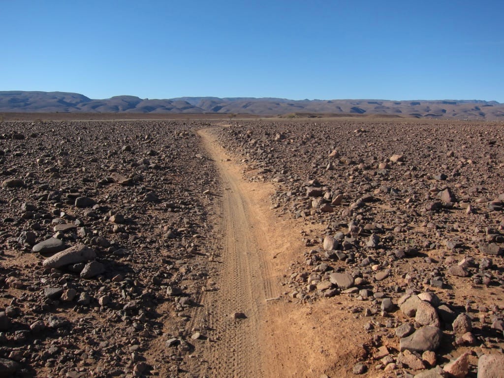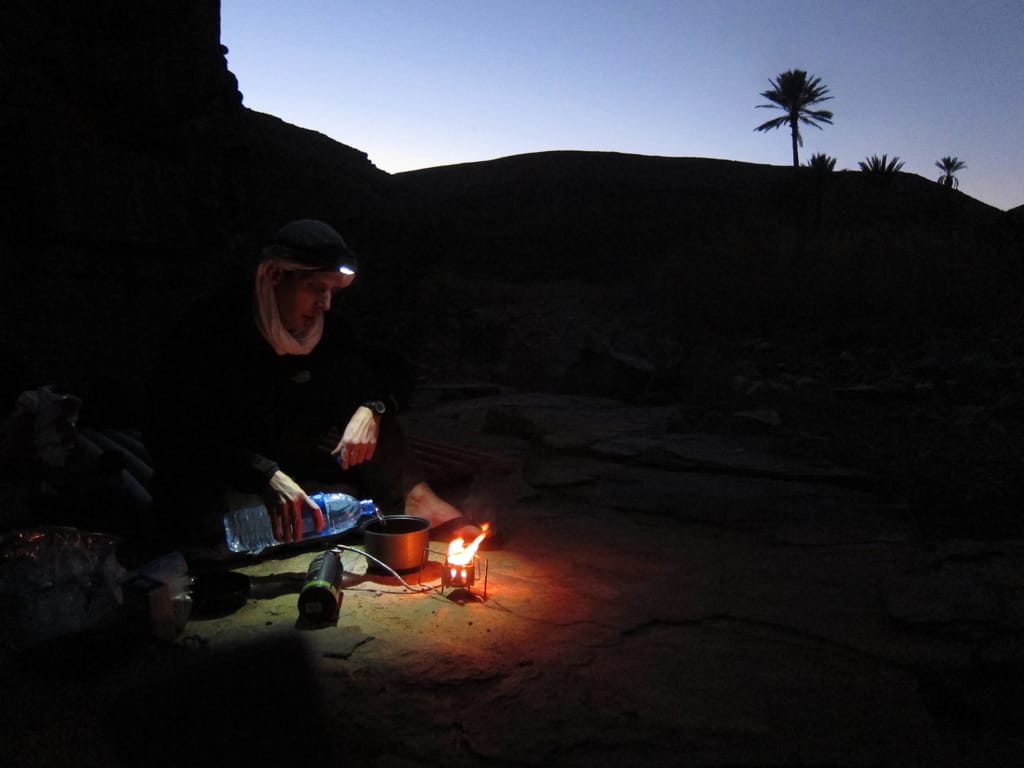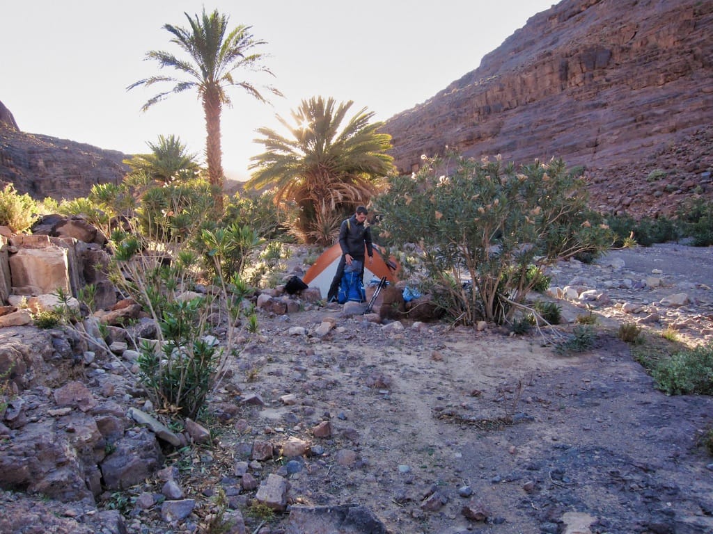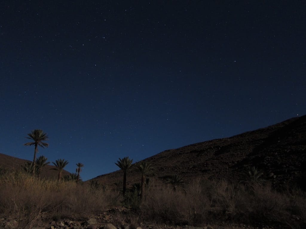 Wir gehen weiter. Dann: Hupen. Ein klappriger Minibus. Nach kurzer Verhandlung lassen wir uns bis Handour bringen. Eine kluge Entscheidung, wie sich zeigt. Hinter dem Dorf schlagen wir unser erstes Lager auf: auf einem leicht erhöhten Felsband über dem Oued. Das Zelt bleibt im Rucksack. Die Nacht verbringen wir unter freiem Himmel unter einem Sternenzelt, das jede Müdigkeit relativiert.