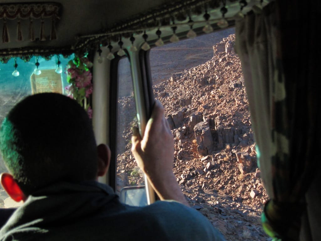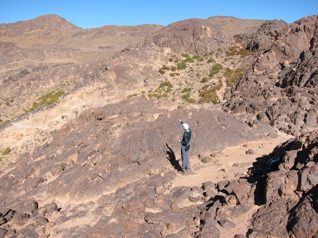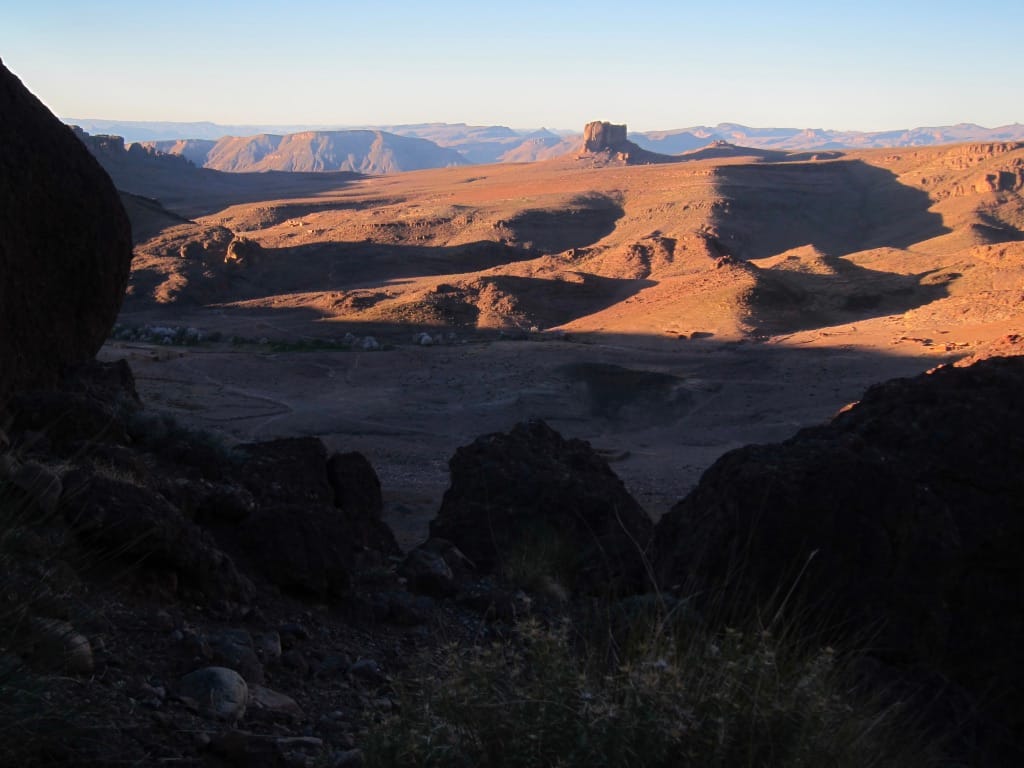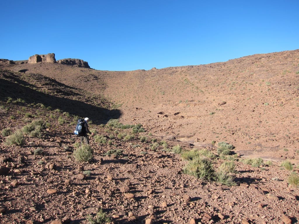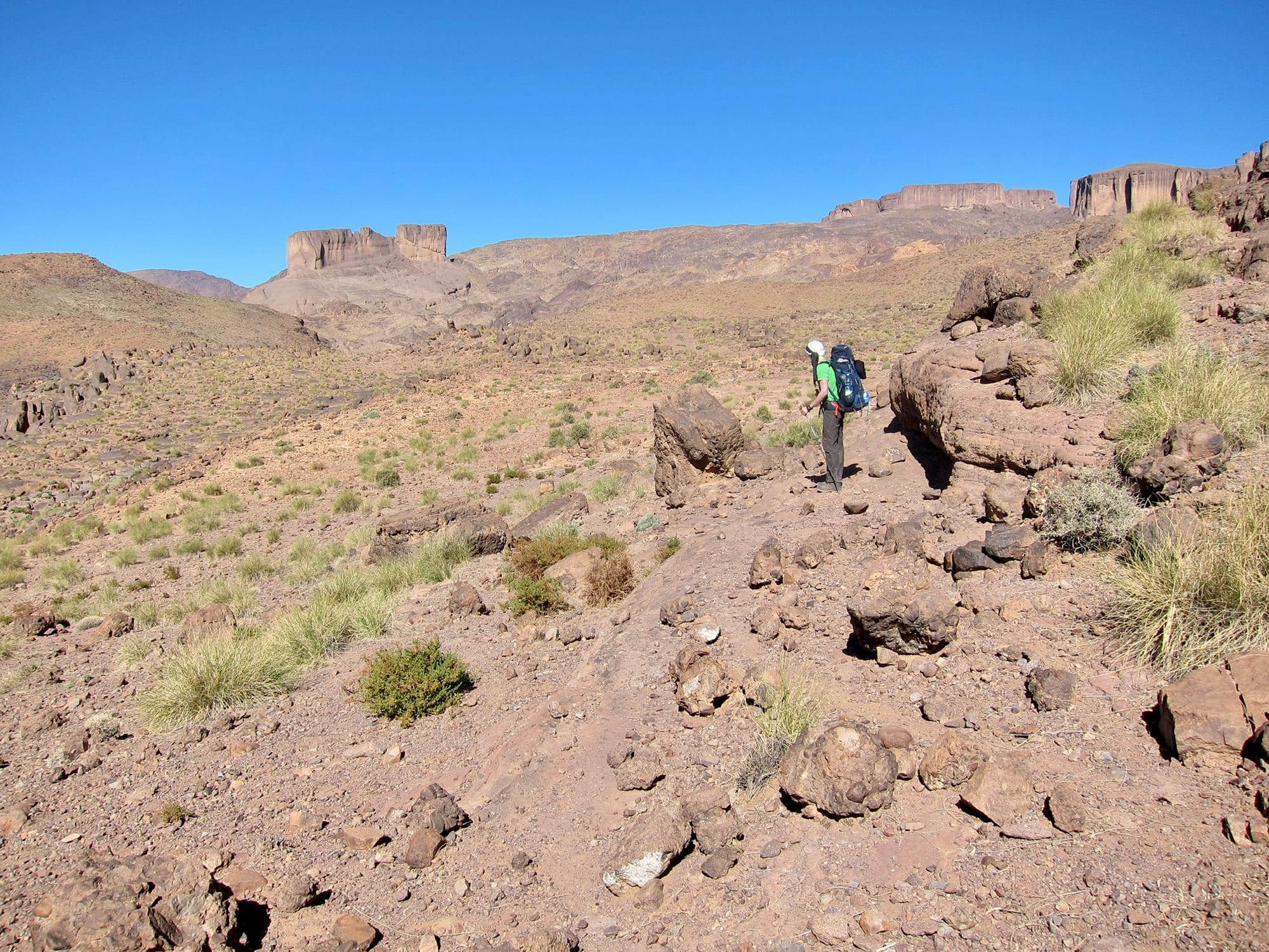 Sehr früh brechen wir auf. Der Aufstieg ist kühl, aussichtsreich. Der Blick reicht zurück bis zum Djebel Bani, dahinter beginnt die Sahara. Wir klopfen Gesteinsblasen auf, Geologie am Wegesrand als Zeitvertreib.