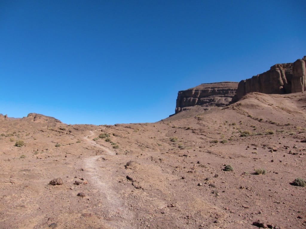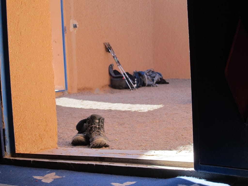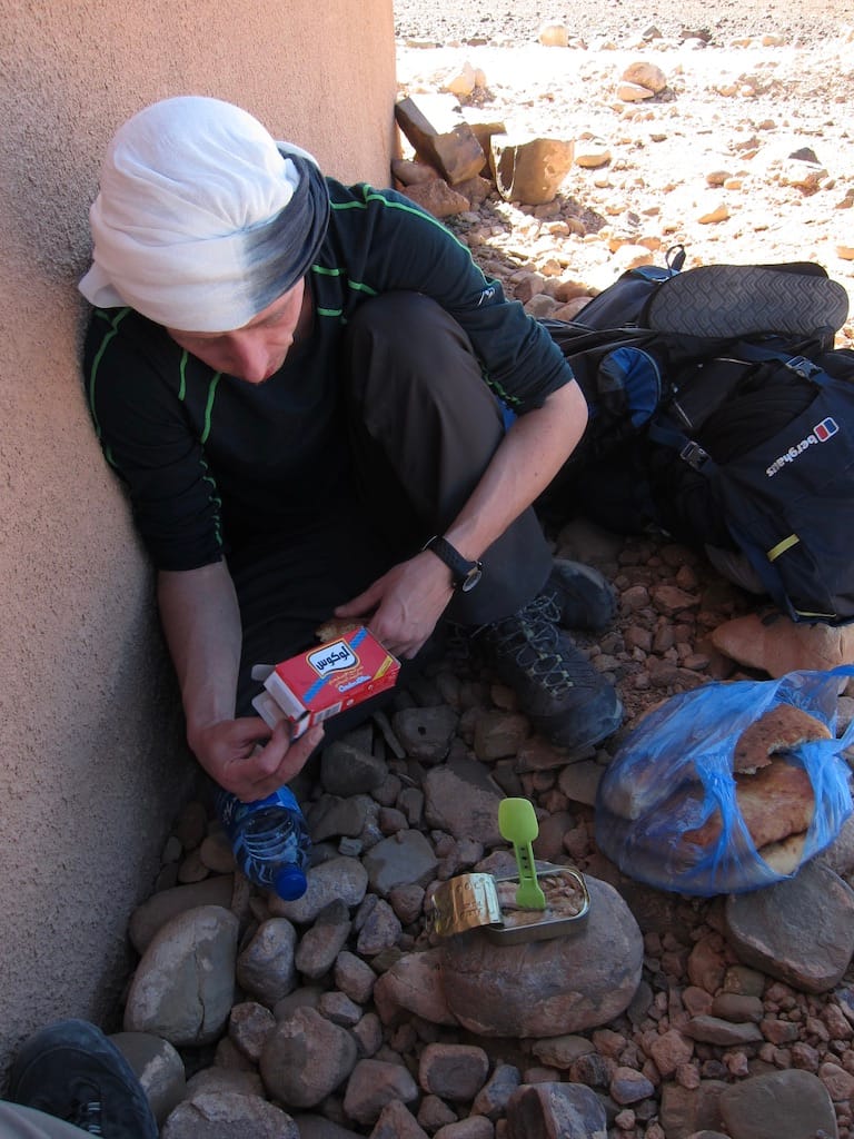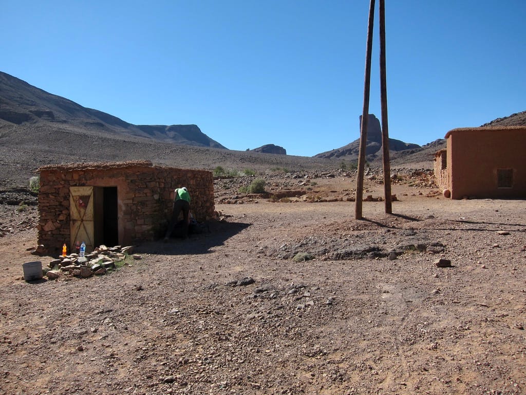 Der Plan ist einfach: die weite, trockene Dades-Ebene queren und anschließend in den Djebel Sarhro aufsteigen. Die Realität holt uns früh ein. Die Hitze ist intensiver als erwartet, der Magen leer, der Weg lang. Im Schatten eines Stromhäuschens legen wir bereits nach kurzer Zeit die erste Pause ein. Eine uns empfohlene Herberge scheint verlockend, erweist sich aber als unerschwinglich. 200 Dirham für eine Nacht (bei einem Restbudget von 400) sind nicht drin.