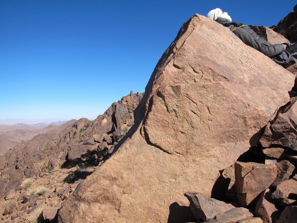 Statt des langen Abstiegs entscheiden wir uns für die Besteigung des Kouaouch. Leichte Kletterei, erst Nebengipfel, dann Hauptgipfel. Oben: 2592 Meter. Im Norden Schnee, im Süden Wüste.