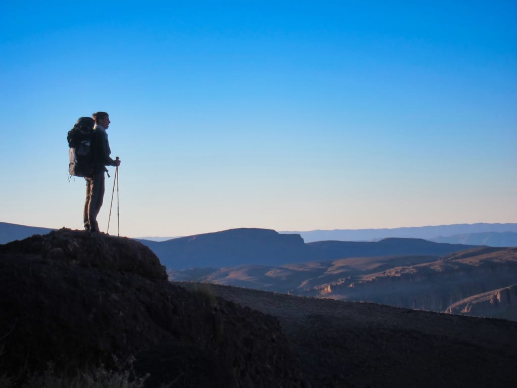 Der Weg zum Bab’n’Ali ist heiß, staubig, erbarmungslos. Wir erreichen das Plateau zur denkbar ungünstigen Mittagszeit. Die Sonne brennt, ungeschützte Haut reagiert sofort. Am Fuß der Felsformation improvisieren wir uns einen Schattenplatz mit Rucksäcken. Erst langsam kühlt der Körper wieder herunter.