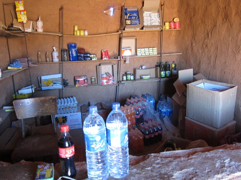 In einem Dorf finden wir schließlich den Hanout, eher ein Haus als ein Laden. Wir sitzen auf Teppichen, trinken Tee, essen Brot mit Olivenöl, Frischkäse und Marmelade. Gespräche, Lächeln, Kinder. Stifte („stylo“) wechseln den Besitzer und werden singend erprobt. Wir lassen heimlich Geld da und ziehen weiter.