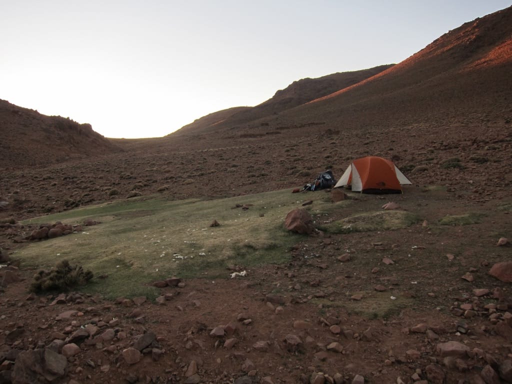 Der Abstieg ist komplex, Pfade verlieren sich, Schluchten blockieren den Weg. Schließlich finden wir wieder eine Spur. Tizi’n Ouarg liegt tief unter uns. Wir zelten auf einer kleinen Wiese, filtern Wasser, kochen ein letztes Mal.